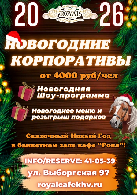 Подробная информация и бронирование по тел:+7(4212) 41-05-39Давайте встретим Новый год вместе в кафе "Роял"!🌟